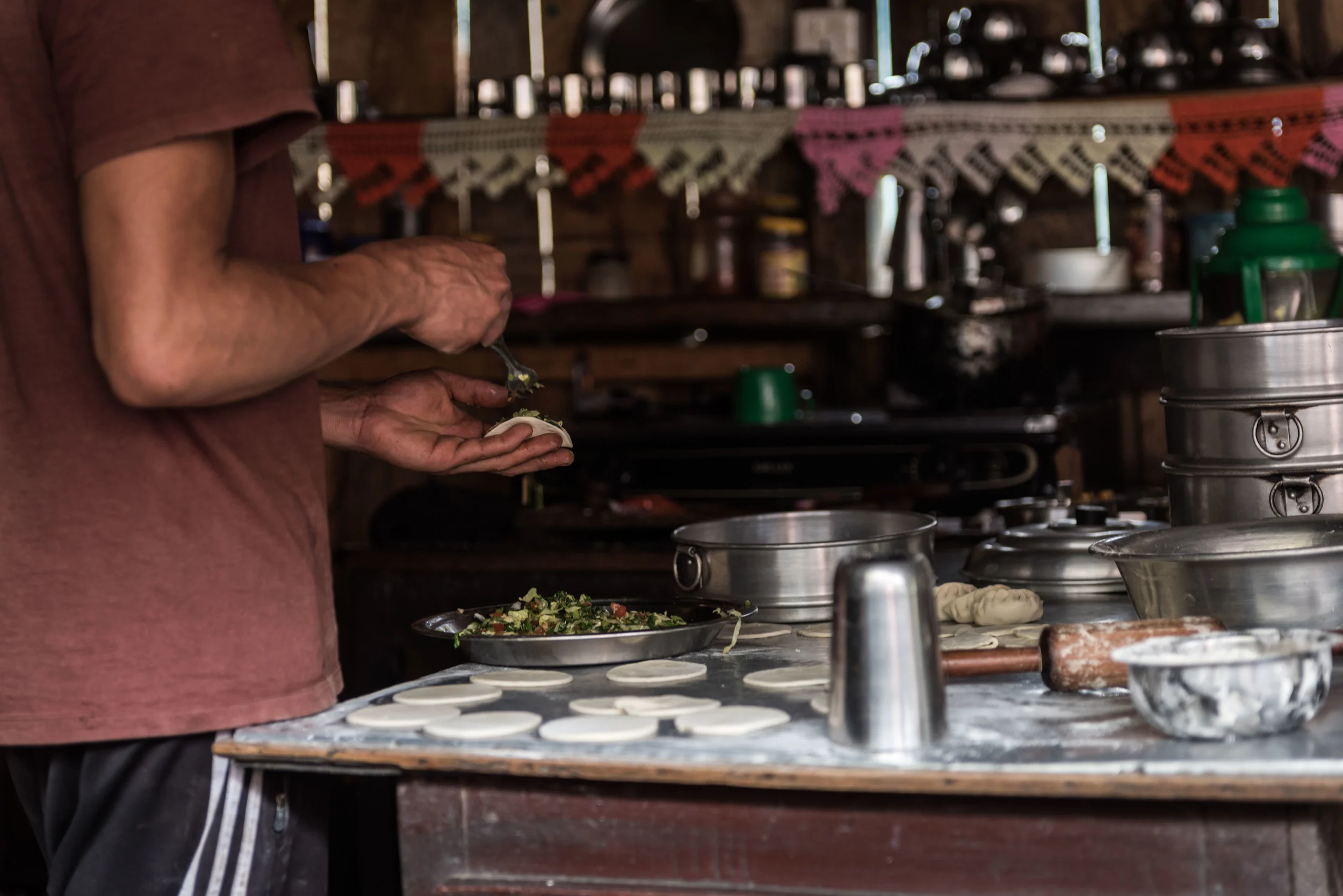 Along the trip we used to stop for lunch at different places and at this one guesthouse between Tadapani and Chomrong you could totally see that they loved to cook. They had LOVE for food. The kitchen was the most decorative I had seen in the mountains and everything was made fresh. Its amazing how they cook with fire and control this heat, not like at home when you just turn down the gas it’s a heat you need to manage here. I was super fortunate enough to actually try and make Momo’s here. Try, being the right word. There’s definitely technique and some practice needed. I can make fresh raviolis day in and day out but the pinch technique of dumplings is something new to me. I’ll definitely look forward to making Momo’s at home. See the concentration face in the pic.